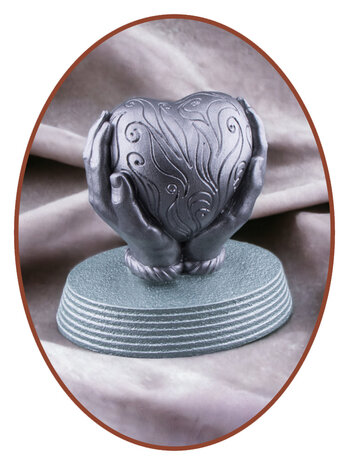 DETAILS: Handmade mini cremation ash urn in "Heart in Hands" design.
