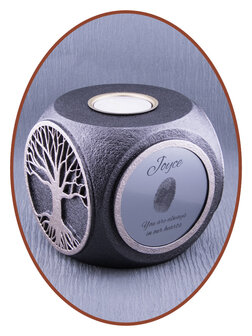 The cube urn is provided with a 'tree of life' symbols on 3 sides, on the back this urn can optionally be provided with an engraving plate in a frame, which can be provided with text engraving, fingerprint, own handwriting, etc.