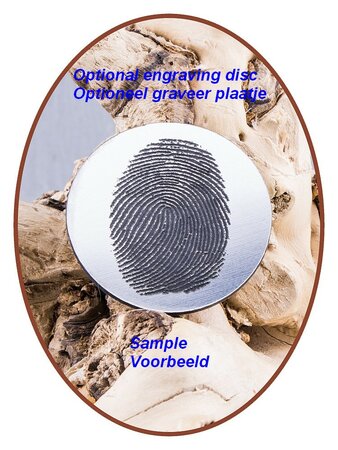 This urn has an stainless steel-look engraving plate, text engraving of this plate is included in the price (Name / Date), other engravings (fingerprints, drawings, hanwriting etc.) are optional available.